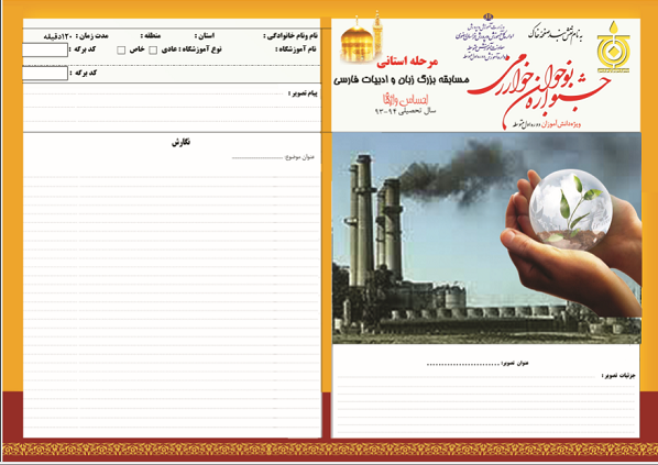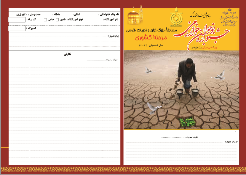 سلام گلدخترا، لطفا یکی از تصاویر زیر را انتخاب کنید و در یک برگ A4 شرحش دهید.از آنچه می بینید تا ارتباط بین آنچه می بینید و در نهایت بیان درک و اجساس خودتان درباره تصویر.لطفا در یک برگ دیگر به موارد خواسته شده در صفحه ی کنار تصویرهم پاسخ دهید.سپاس